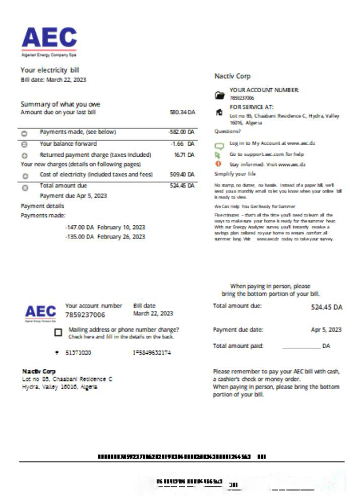 AEC Algerian Energy Company utility business bill, SCR download template file