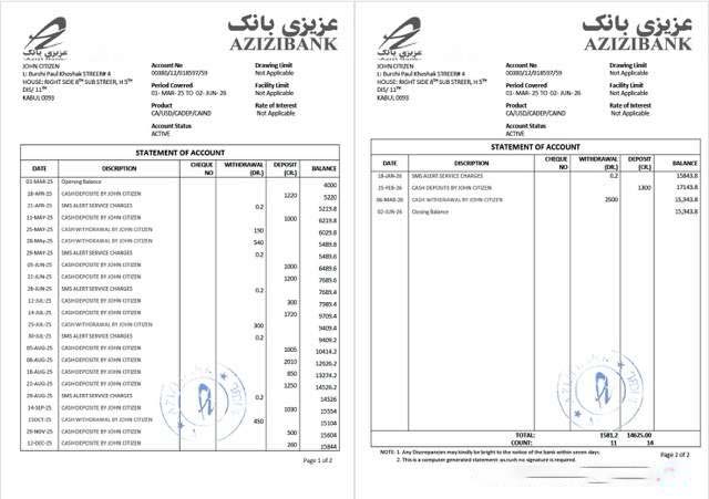 Afghanistan Ghazanfar Bank account statement Word and PDF template download template file