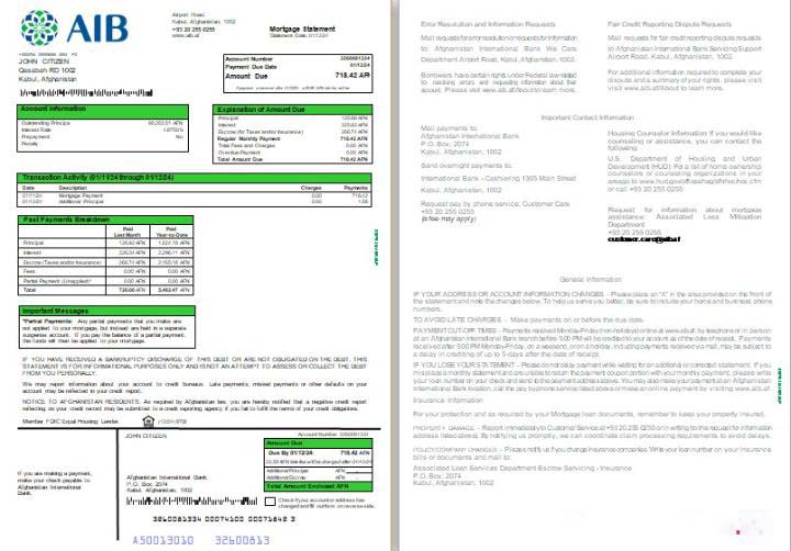 Afghanistan International Bank (AIB) mortgage statement, 3 pages 1 2 scr download template file