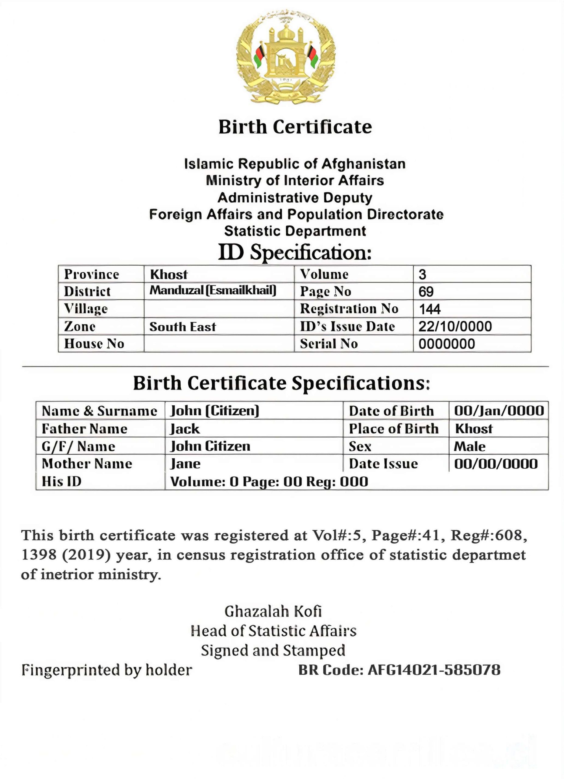 Afghanistan vital record birth certificate editable PSD template, version 2 download template file