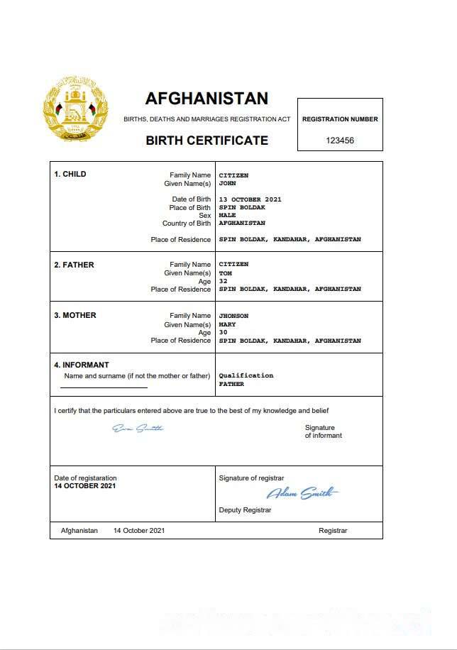 Afghanistan vital record birth certificate Word download template file