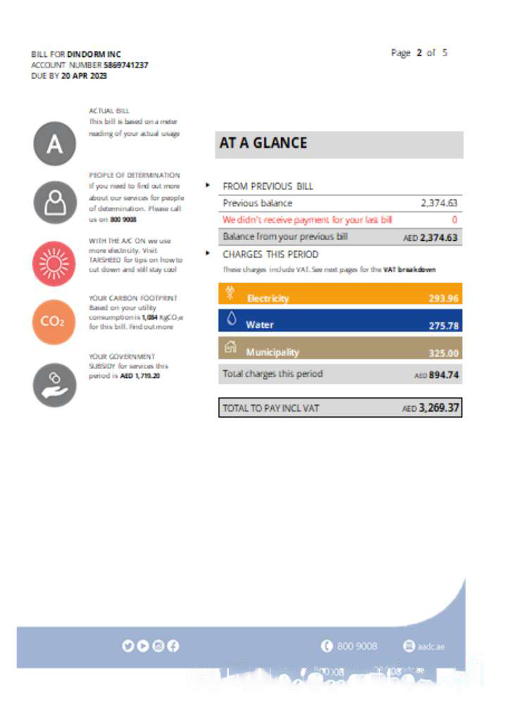 Al Ain Distribution Company utility business bill, page 2, SCR download template file