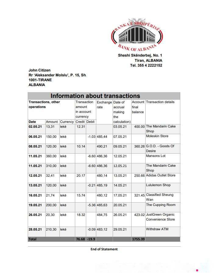 Albania Bank of Albania bank statement template in Excel an PDF format download template file