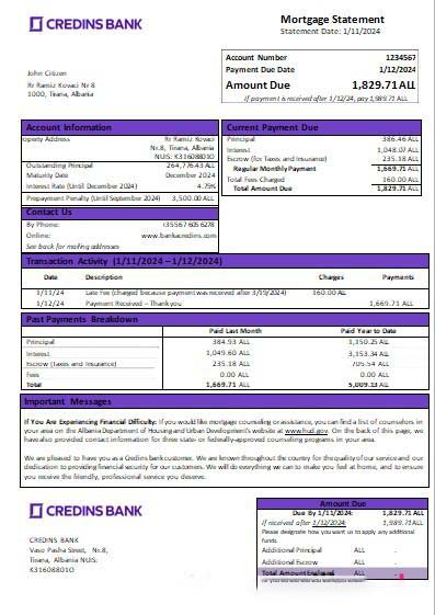 Albania Credins bank mortgage statement scr download template file