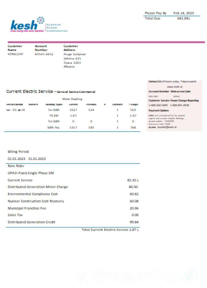 Albanian Power Corporation utility business bill, SCR download template file