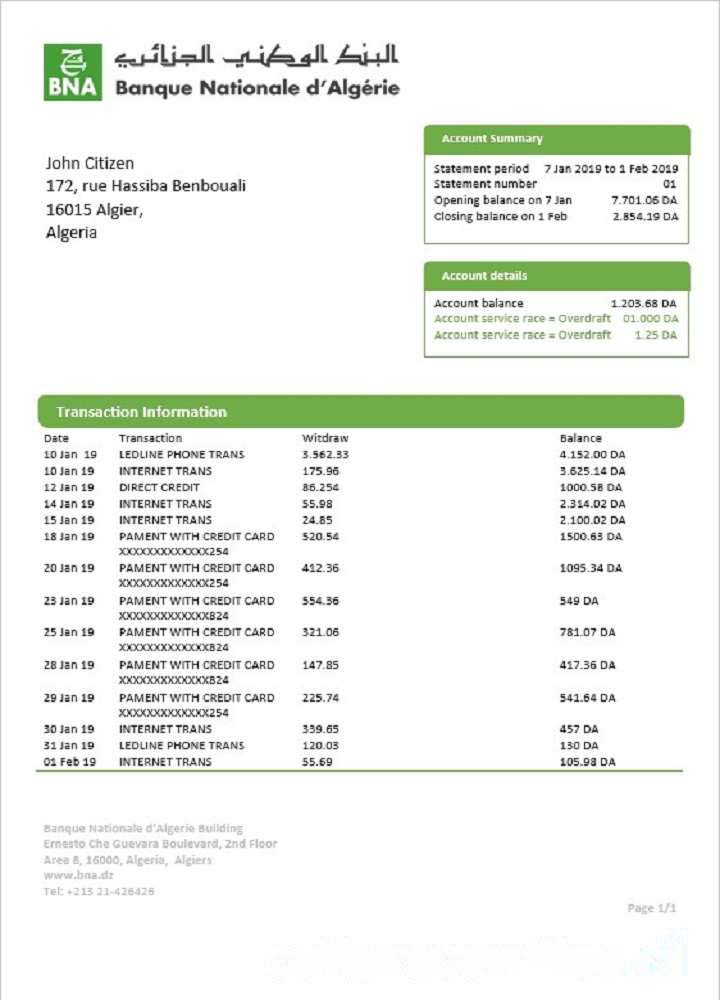 Algeria Banque nationale d??Alg??rie (BNA) bank statement download template file