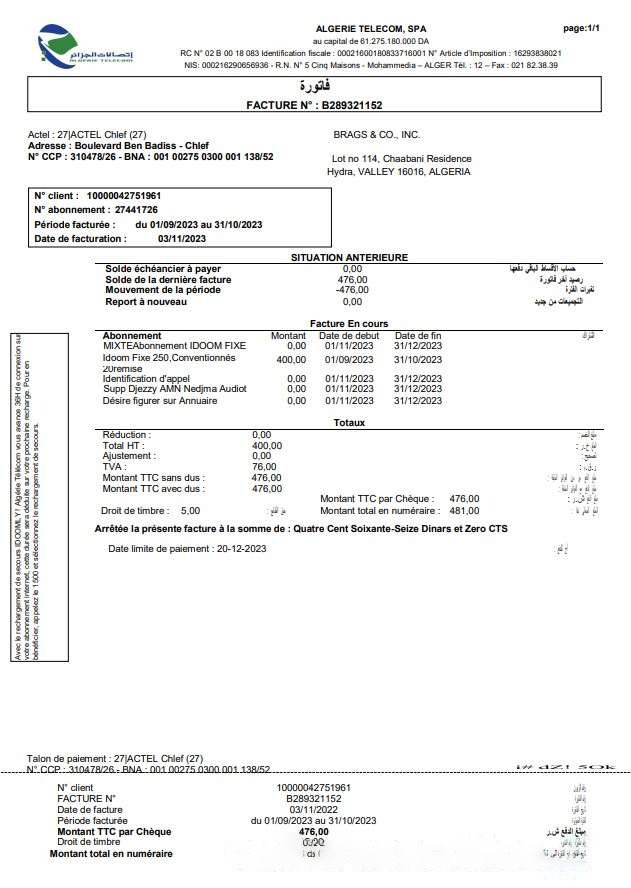 Algerie Telecom utility business bill, Word and PDF template download template file