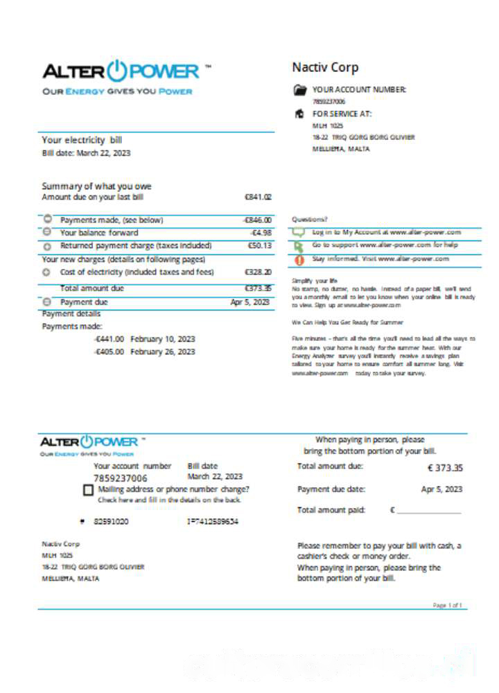 Be the first to review “AlterPower Malta proof of address utility business bill, SCR download template file”