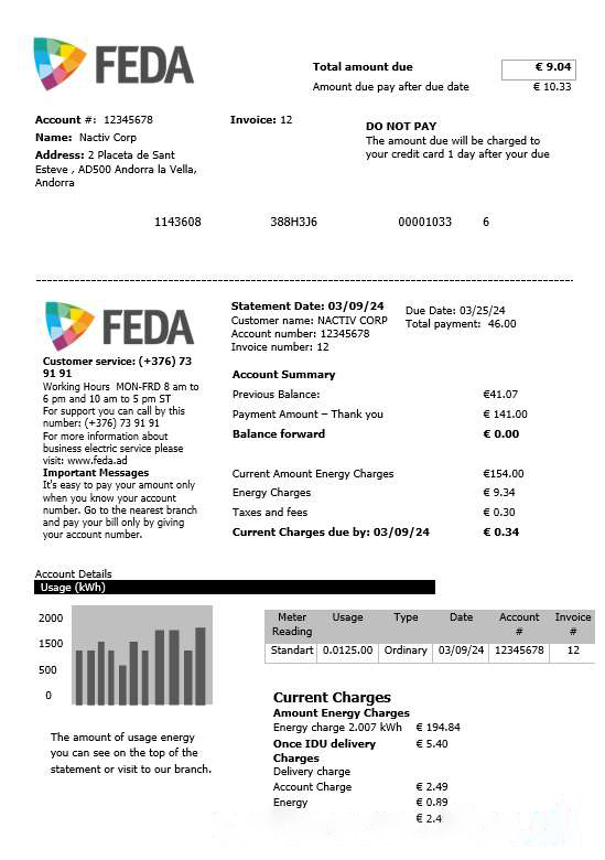 Andorra Electric Forces of Andorra business utility bill template in Word and PDF formats download template file