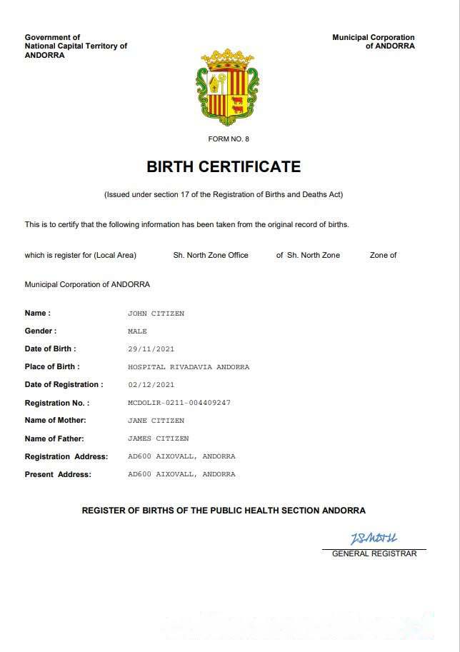 Andorra vital record birth certificate Word and PDF template download template file