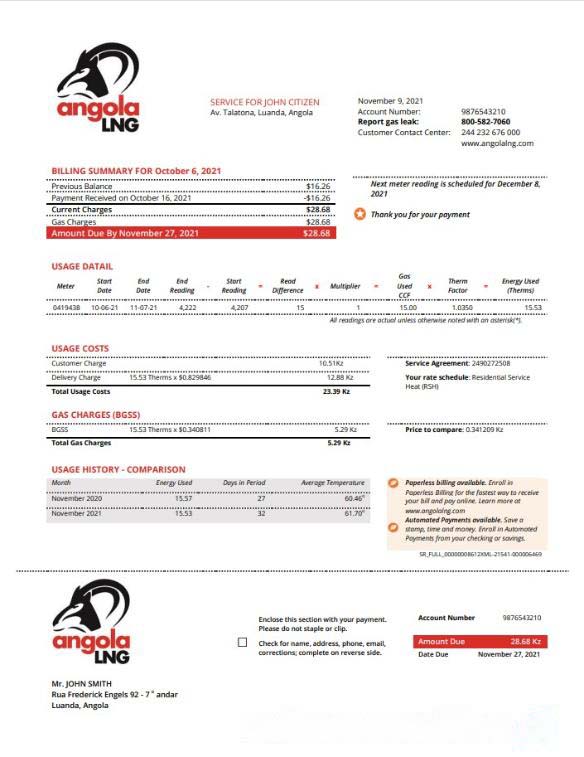 Angola LNG proof of address utility bill template in Word and PDF format download template file