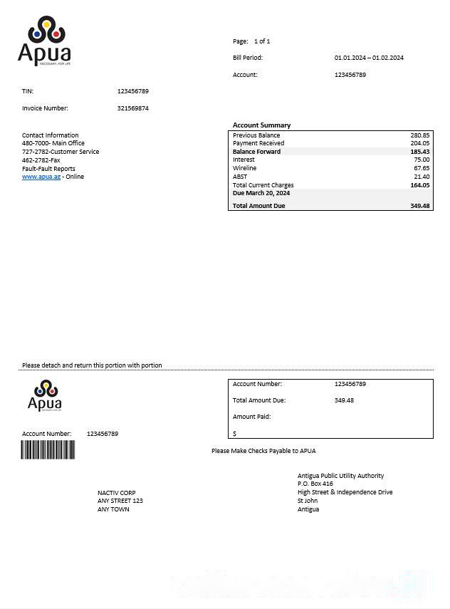 ANTIGUA AND BARBUDA APUA business utility bill Word and PDF template download template file