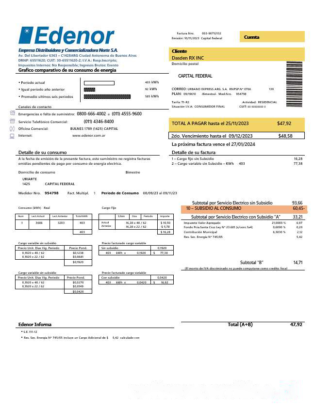 Argentina Edenor easy to fill business utility bill template in Word and PDF format download template file