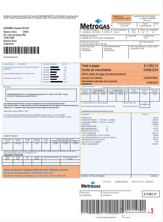 Argentina Metrogas easy to fill business utility bill template in Word and PDF format download template file