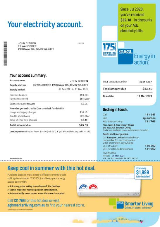 Australia AGL electricity utility bill template, fully editable in PSD format download template file