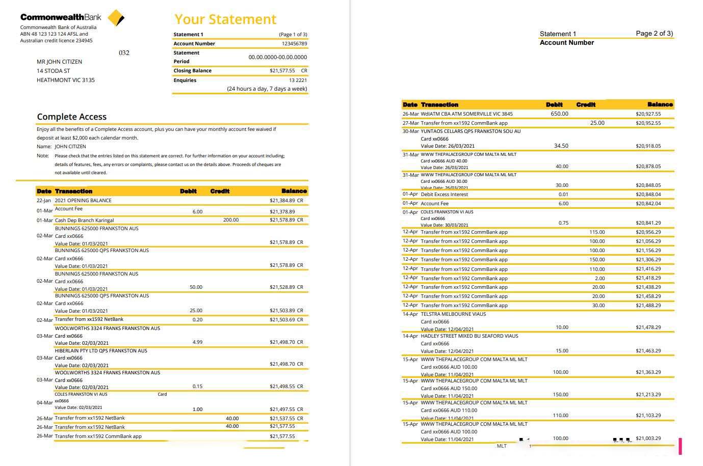 Australia Commonwealth bank statement template in Excel and PDF format (3 pages), version 2 download template file