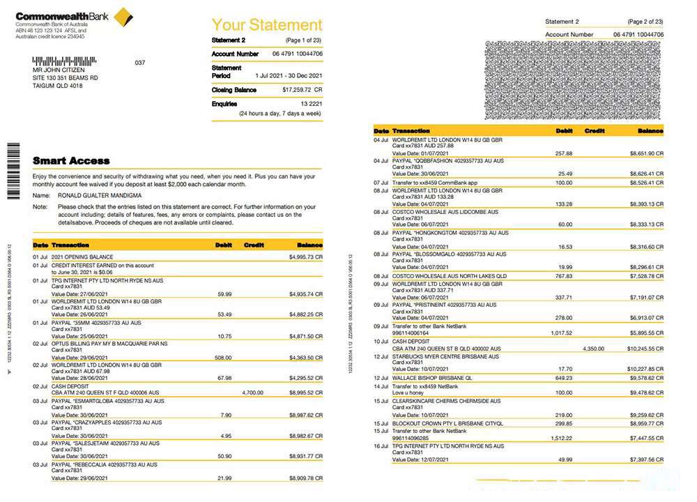 Australia Commonwealth bank statement template in Word and PDF format, 23 pages download template file