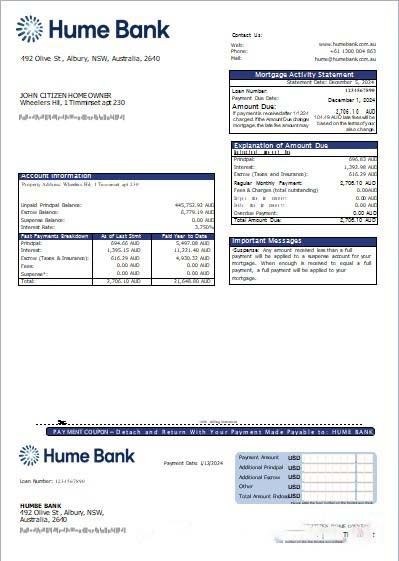 Australia Humebank bank mortgage statement scr download template file