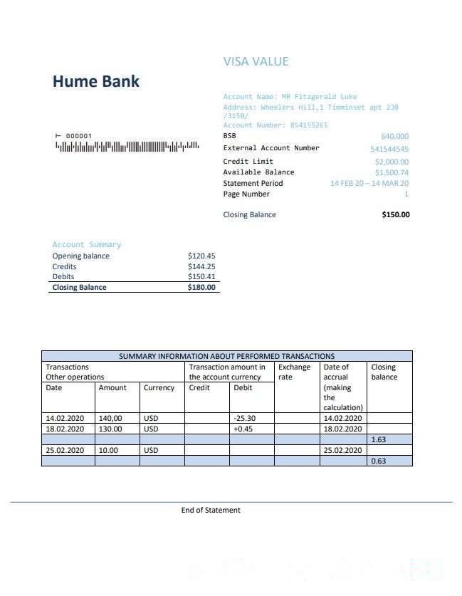 Australia Humebank proof of address statement template in .doc and .pdf format, fully editable download template file