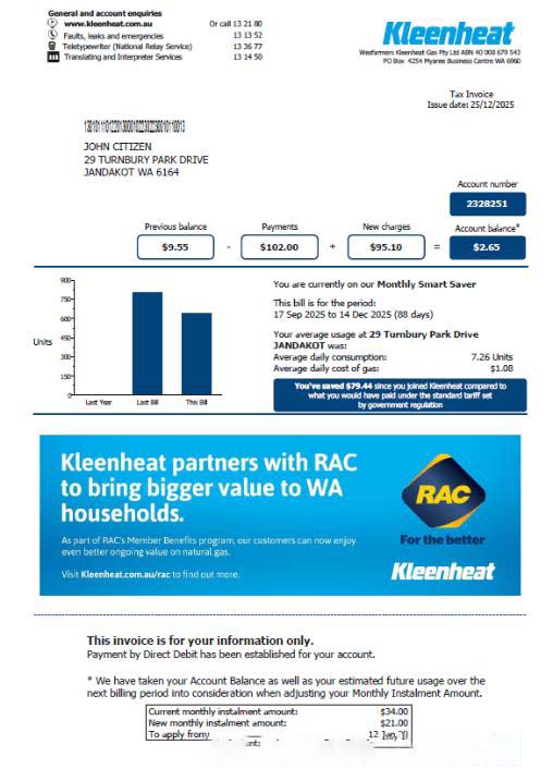 Australia Kleenheat utility bill template in Word and PDF formats download template file