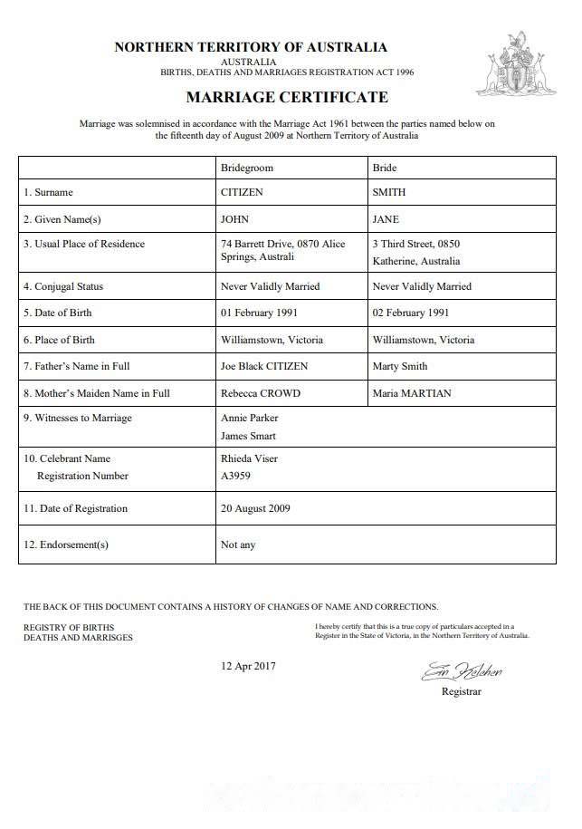 Australia Northern Territory of Australia marriage certificate template in Word download template file