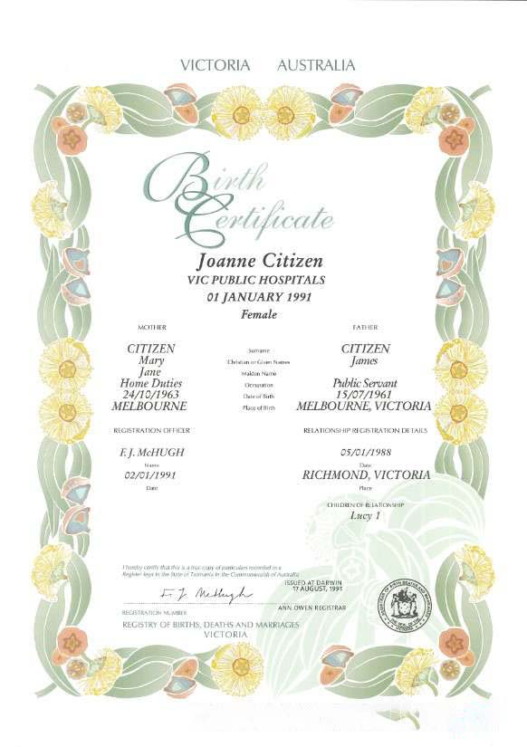 Australia Victoria state decorative (commemorative) birth certificate template in PSD download template file