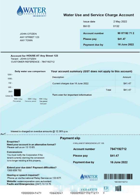 Australia Water Corporation WA utility bill .doc and .pdf template download template file