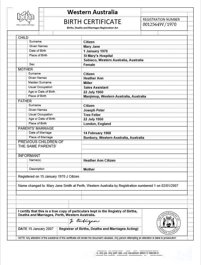 Australia Western Australia birth certificate template in Word format, version 3 download template file