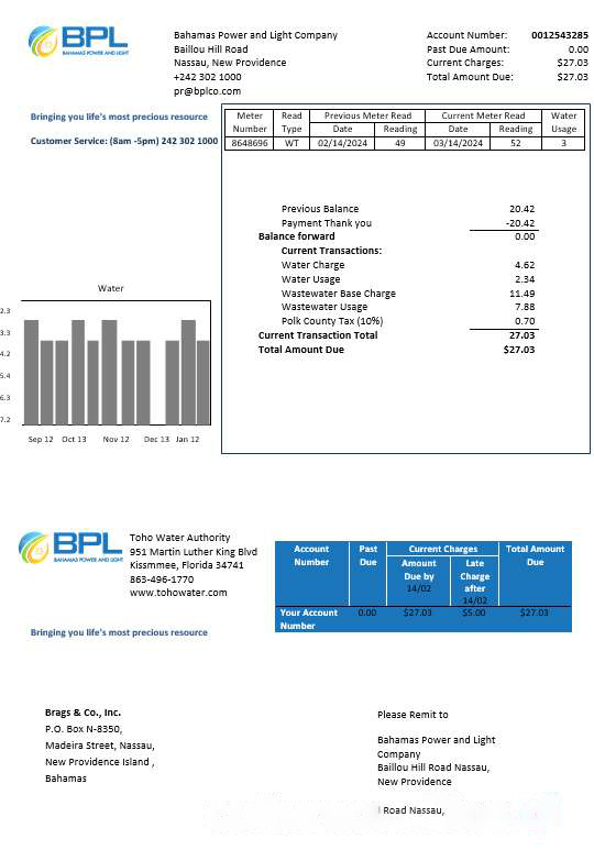 Bahamas Power and Light Company business utility bill template in Word and PDF format download template file