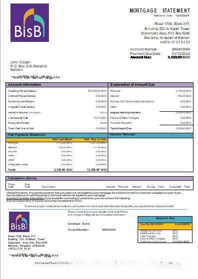 Bahrain BISB bank mortgage statement scr download template file