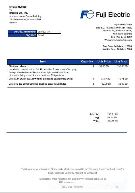 Bahrain Falcon Electrical S.P.C electricity business utility bill template in Word and PDF format download template file