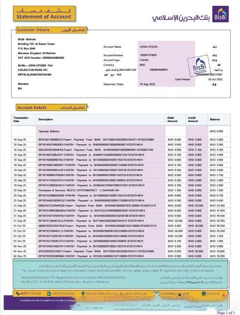 Bahrain Islamic Bank statement of account Word and PDF template download template file