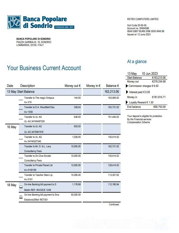 Banca Populaire di Sondrio Business Bank statement Word and PDF template download template file