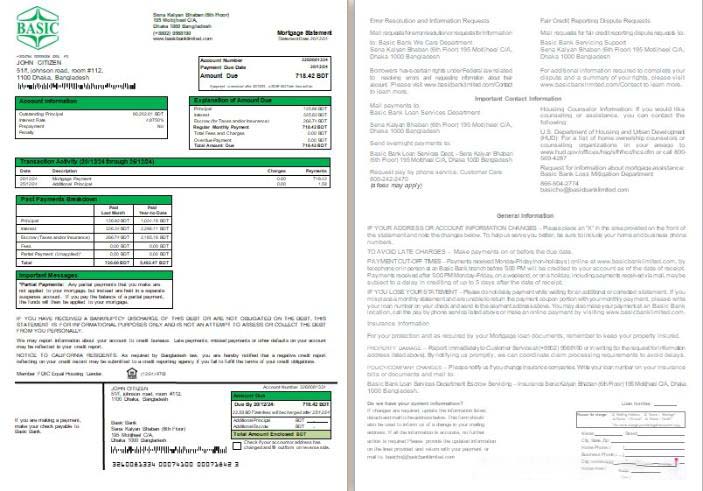 Bangladesh Basic Bank bank mortgage statement, 2 pages, 1 2 scr download template file