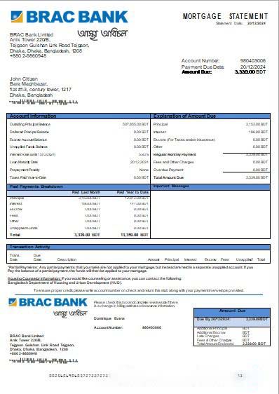 Bangladesh BRAC Bank bank mortgage statement scr download template file