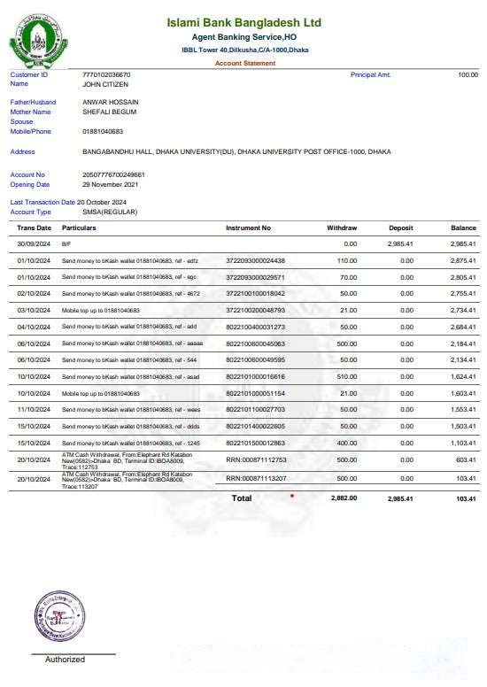 Bangladesh Islami Bank statement Word and PDF example download template file