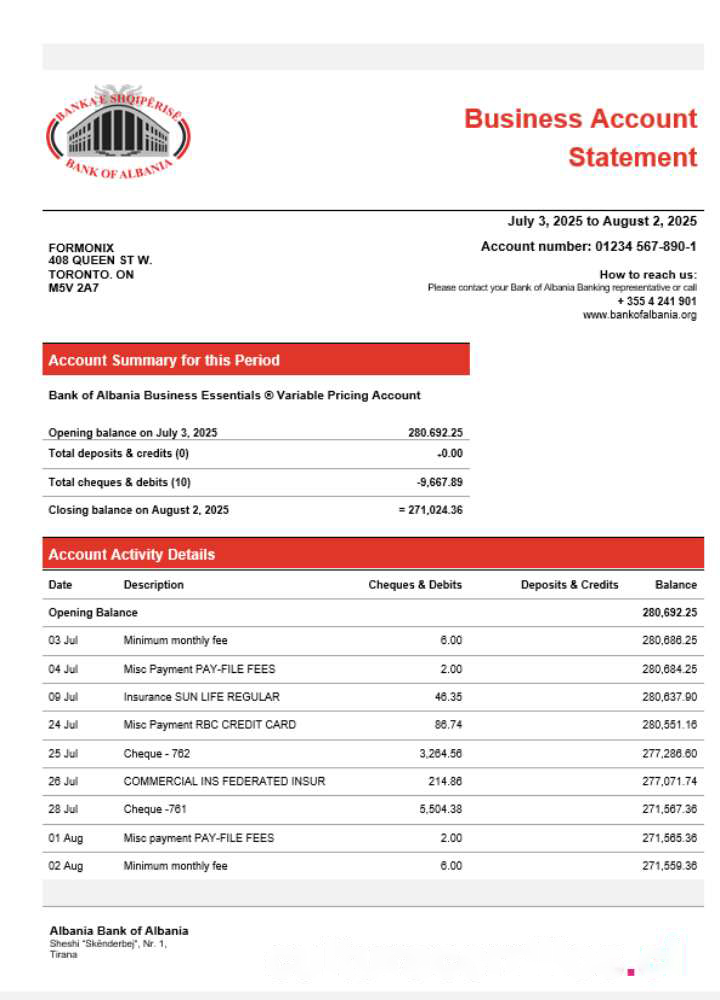 Bank of Albania business account statement Word and PDF template download template file