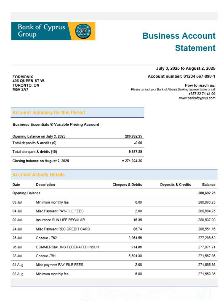 Bank of Cypriot firm account statement Word and PDF format download template file