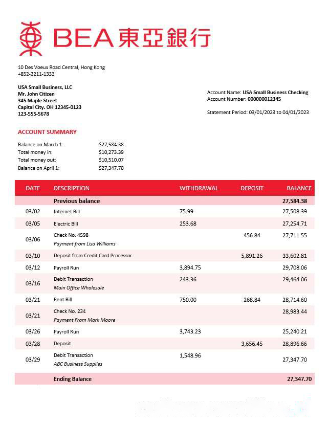 Bank of East Asia firm account statement Word and PDF template download template file