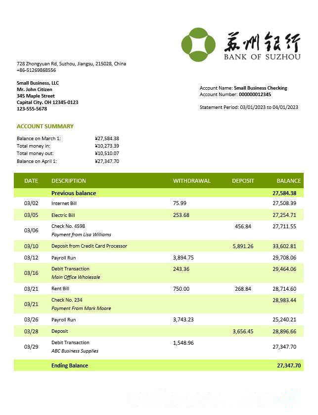 Bank of Suzhou firm account statement Word and PDF template download template file