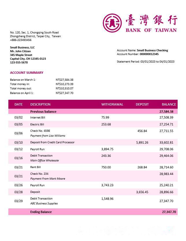 Bank of Taiwan company checking account statement Word and PDF template download template file