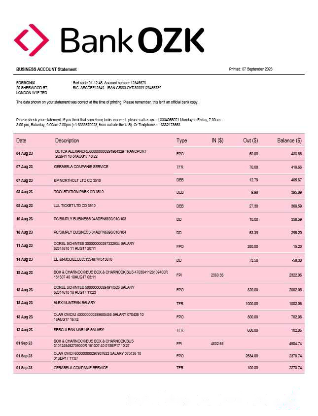 Bank of the Ozarks firm account statement Word and PDF template download template file
