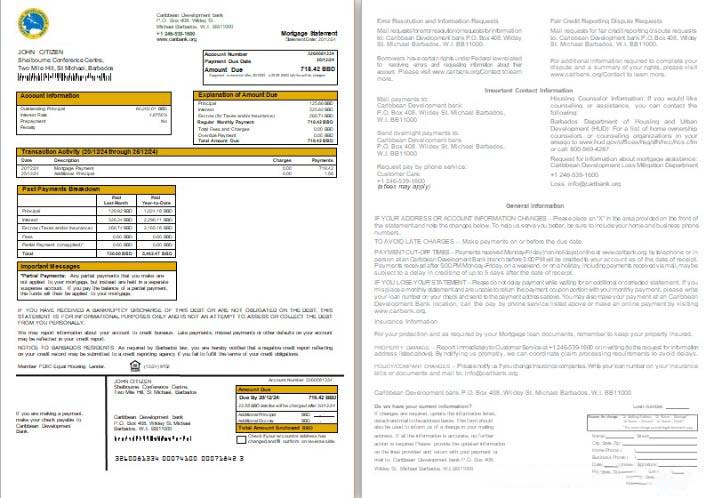 Barbados Caribbean Development bank mortgage statement, 2 pages, 1 2 scr download template file