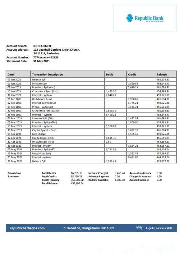 Barbados Republic Bank statement template in Word and PDF format download template file