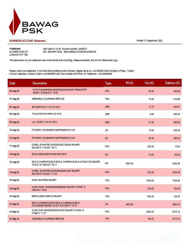 BAWAG PSK Bank firm account statement Word and PDF template download template file