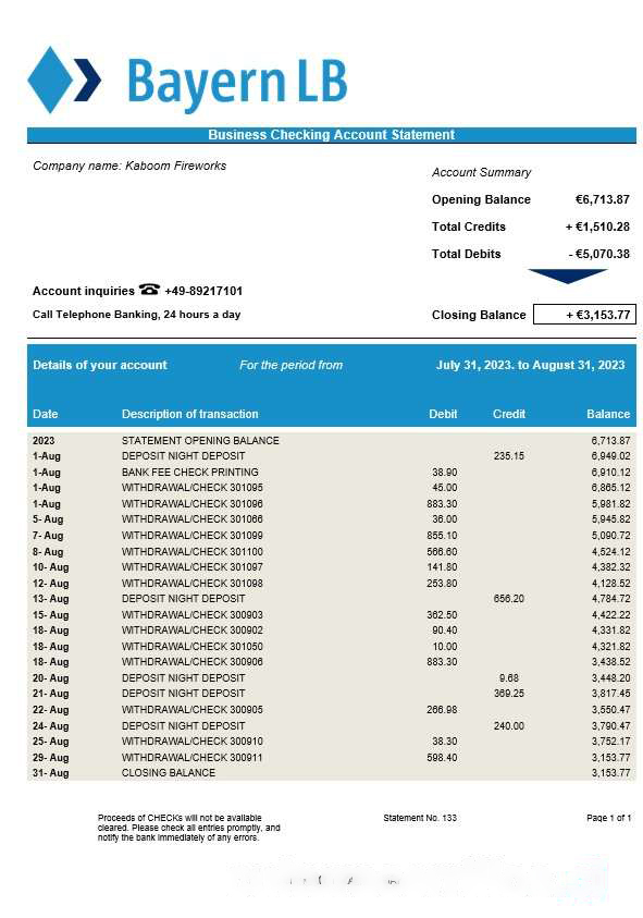 Bayerische Landesbank Bank firm account statement Word and PDF template download template file