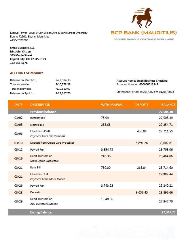BCP Bank enterprise account statement Word and PDF template download template file
