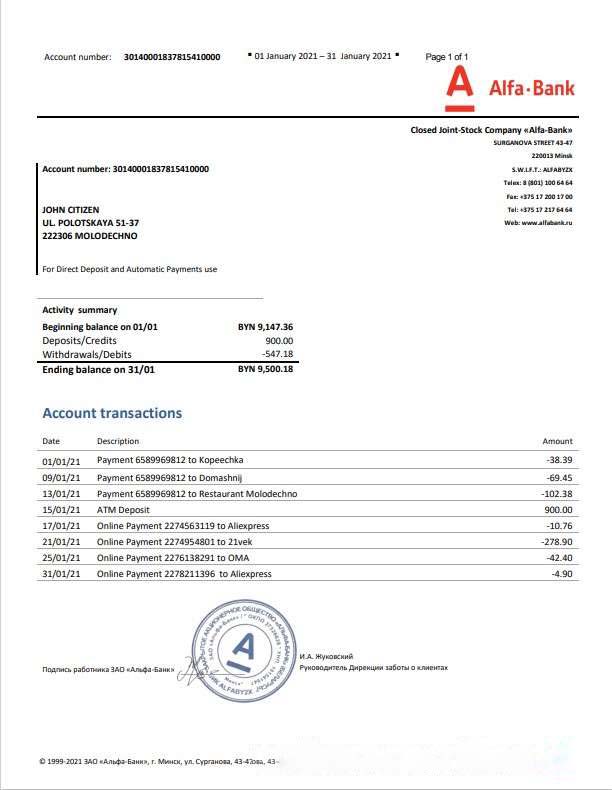 Belarus Alfa bank statement template in Word and PDF format download template file