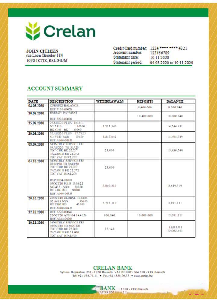 Belgium Crelan bank statement template in Word and PDF format download template file