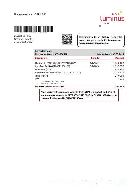 Belgium Luminus business utility bill template in Word and PDF format download template file